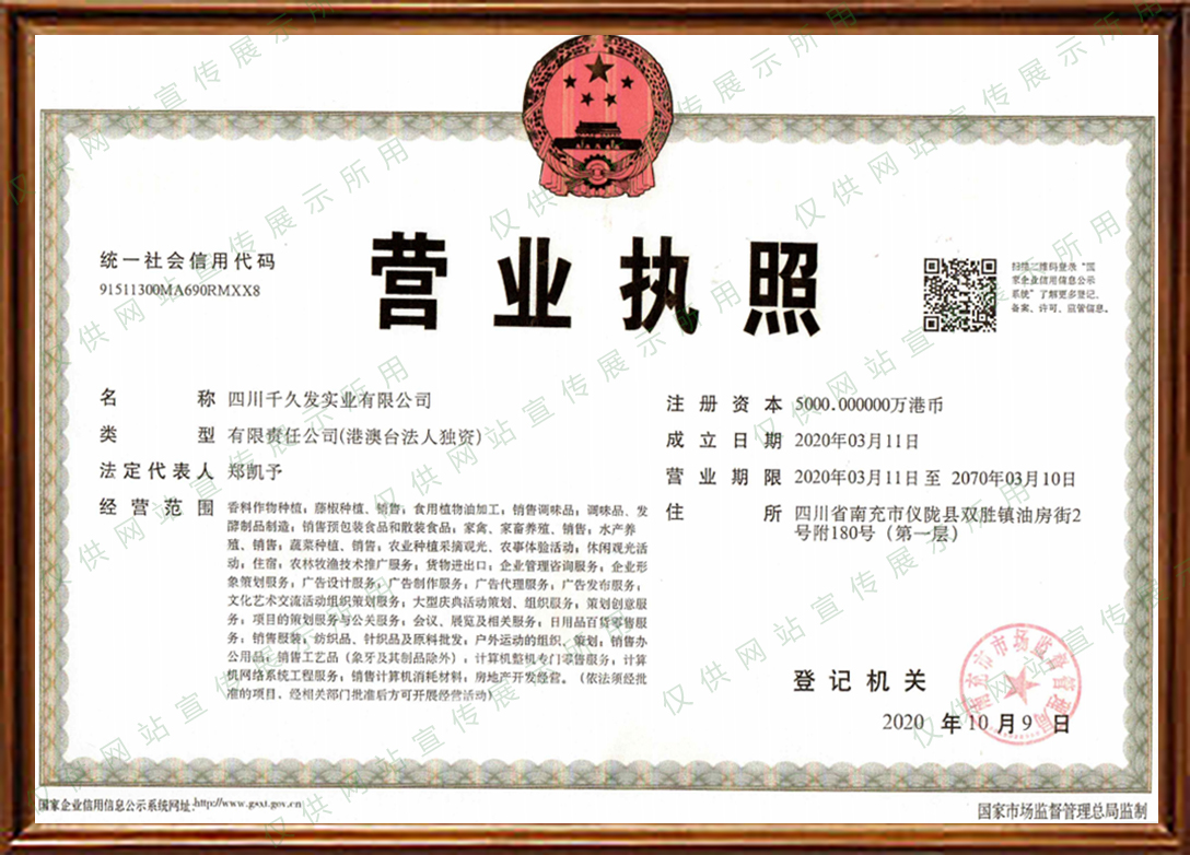 四川千久發(fā)實(shí)業(yè)有限公司為香港中南海集團(tuán)旗下全資子公司,主營(yíng)調(diào)味品、發(fā)酵制品、食用植物油生產(chǎn)、加工、銷售;預(yù)包裝食品兼散裝食品銷售;生物藥品銷售;農(nóng)業(yè)觀光旅游,住宿服務(wù)。我們傾力打造生態(tài)農(nóng)業(yè)基地,現(xiàn)有花椒基地近萬畝,位于朱德故里四川省儀隴縣雙勝鎮(zhèn),獨(dú)特的地理?xiàng)l件和自然氣候非常有利于九葉青花椒的種植和生長(zhǎng)。