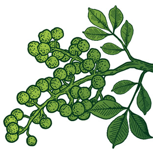 花椒果實的揮發(fā)油中含量最多的是4-松油烯醇,占13.46%,還有辣薄荷酮(piperitone)占10.64 %,芳樟醇占9.10%,香檜烯占9.7%,檸檬烯占7.30%,鄰-聚傘花素(o-cymene)占7.00%,月桂烯占3.00%以及α-和β-蒎烯,α-松油醇等。