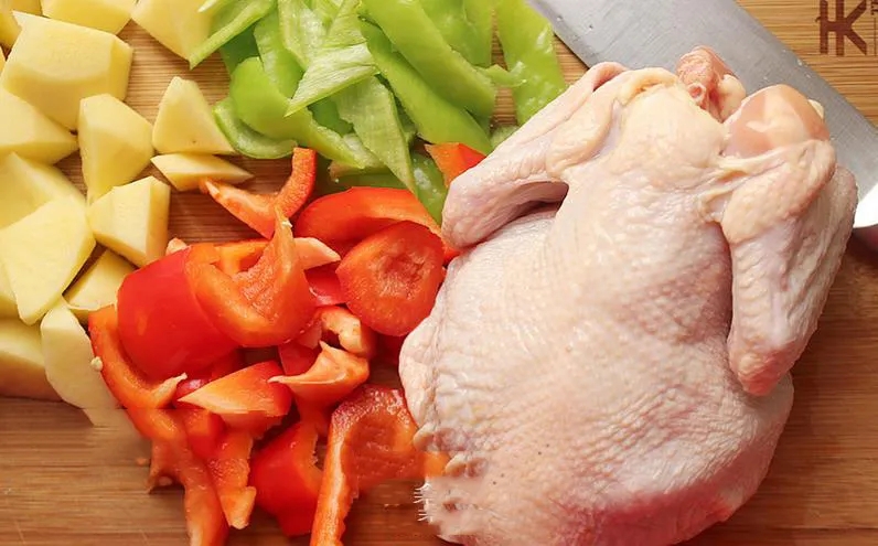 1>三黃雞一只,土豆、尖椒和紅椒都切塊。