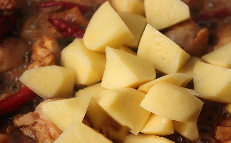 8>然后加入土豆塊。之后加鹽糖生抽調(diào)味。鹽不需要很多(郫縣豆瓣本身有咸度)。小火煮至開始收汁。