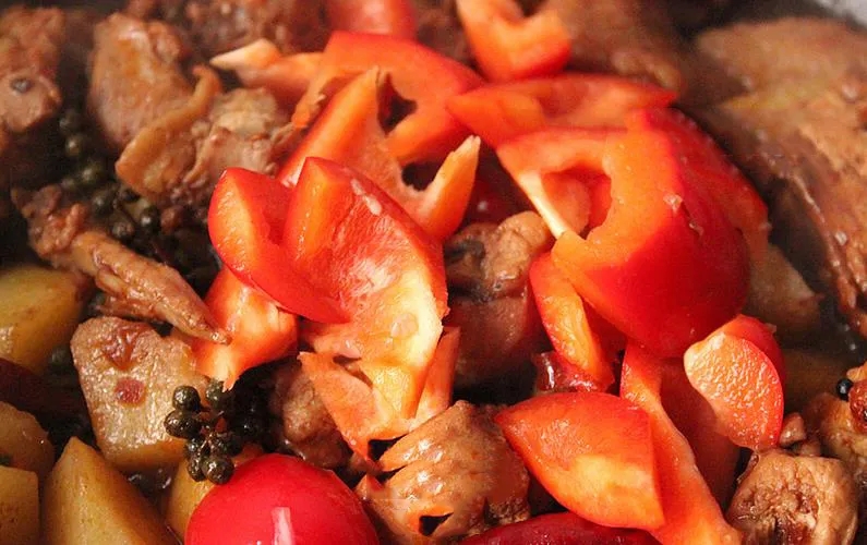 9>土豆能戳爛之后加入紅椒翻炒勻均,這時候湯也收的差不多了。紅椒斷生之后加入尖椒翻勻,關(guān)火完成!