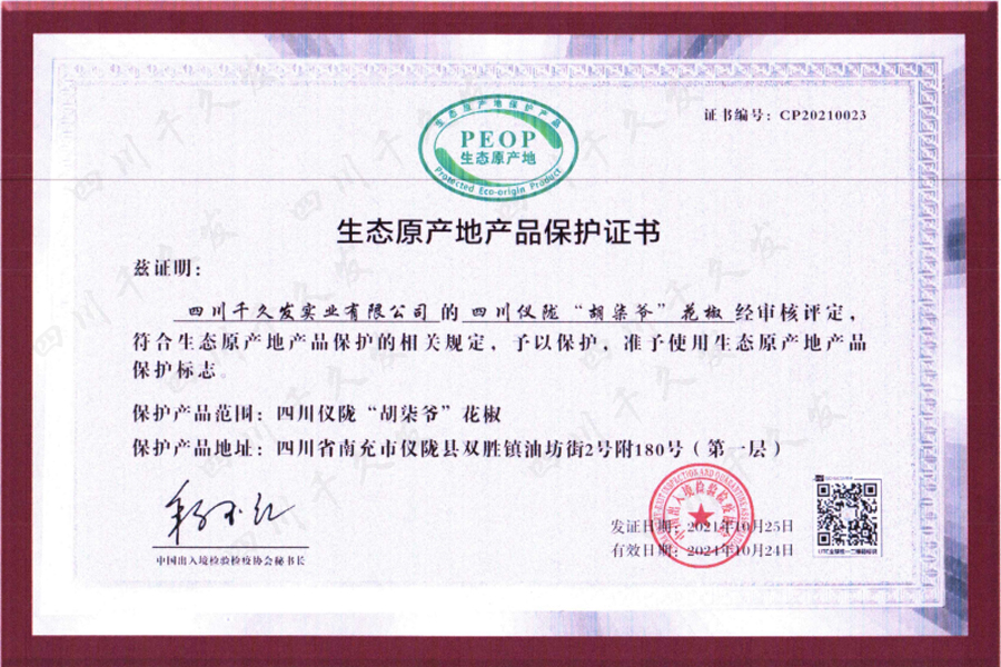 ? ? ? ? 2021年8月,根據(jù)企業(yè)申請,經(jīng)中國出入境檢驗檢疫協(xié)會生態(tài)原產(chǎn)地產(chǎn)品保護管理辦公室批準,成都海關技術中心組成專家組,對四川千久發(fā)實業(yè)有限公司申請的四川儀隴“胡柒爺”花椒生態(tài)原產(chǎn)地產(chǎn)品保護進行了現(xiàn)場評審。此次評審由四川出入境檢驗檢疫協(xié)會高級顧問、特聘專家劉育禾擔任評審組長、成都海關技術中心高級農(nóng)藝師、食品加工與安全領域專家楊苗、成都海關技術中心環(huán)境監(jiān)測、農(nóng)產(chǎn)品加工領域專家、正高級工程師俞凌云、成都海關技術中心食品安全與檢測技術領域專家、高級工程師方智擔任評審員,組成專家組進行評審工作。